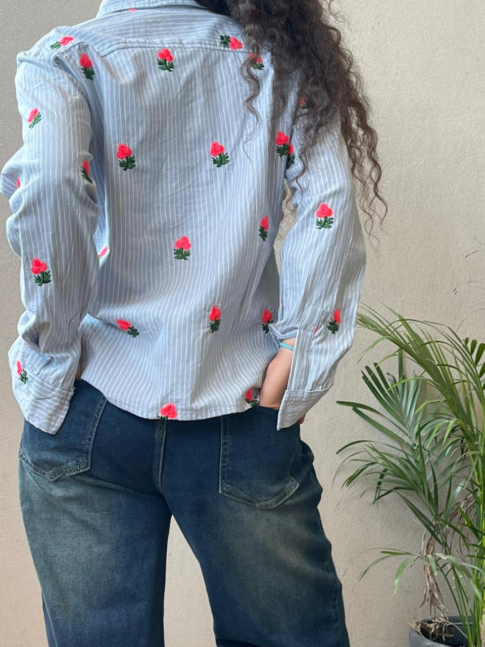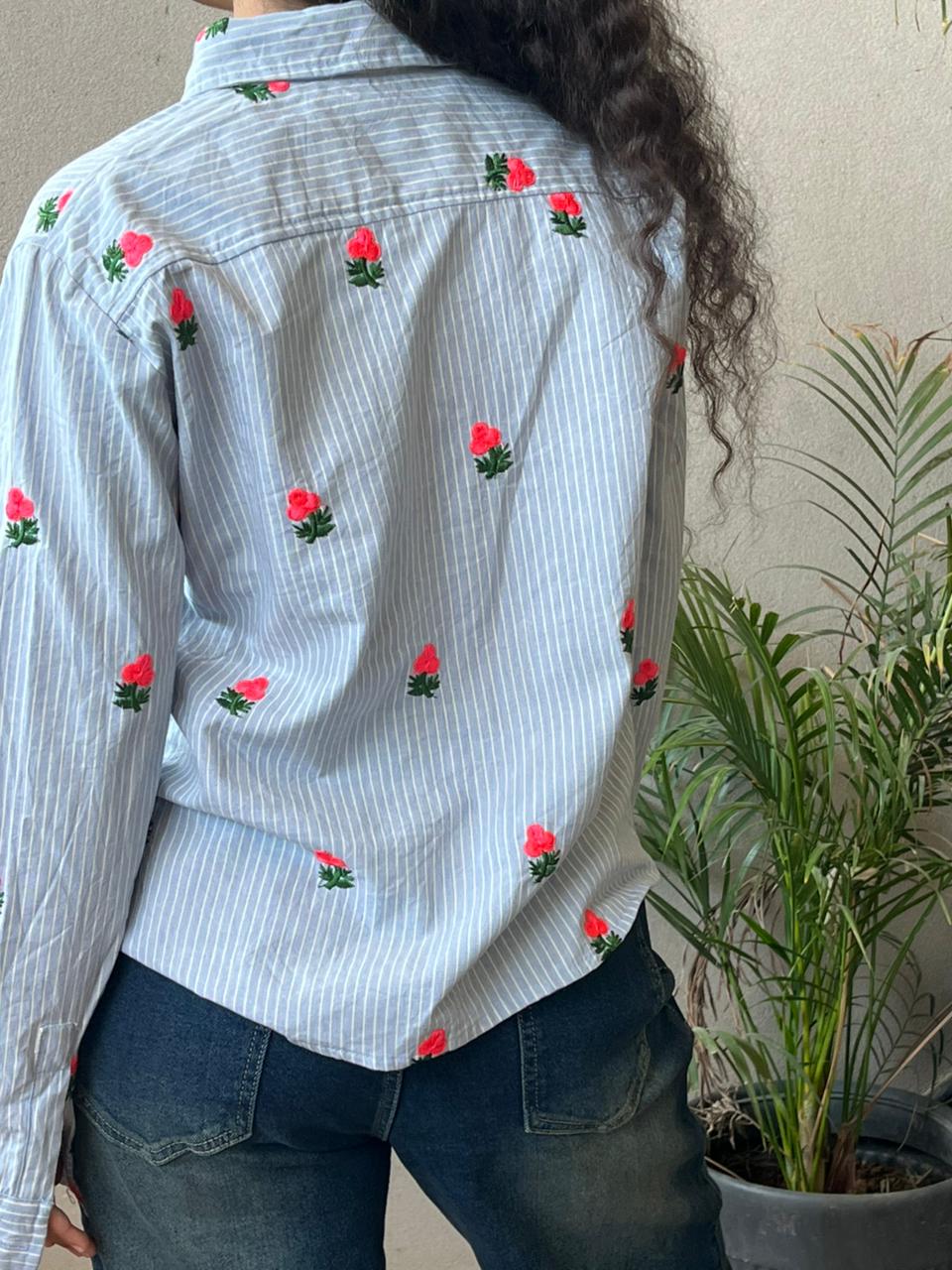 Fresh, feminine, and effortlessly stylish — this Grey Pinstripe Floral Embroidered Shirt blends classic tailoring with delicate detailing. Crafted in a subtle vertical pinstripe base, the shirt is elevated with scattered pink floral embroidery that adds a soft, charming touch.
