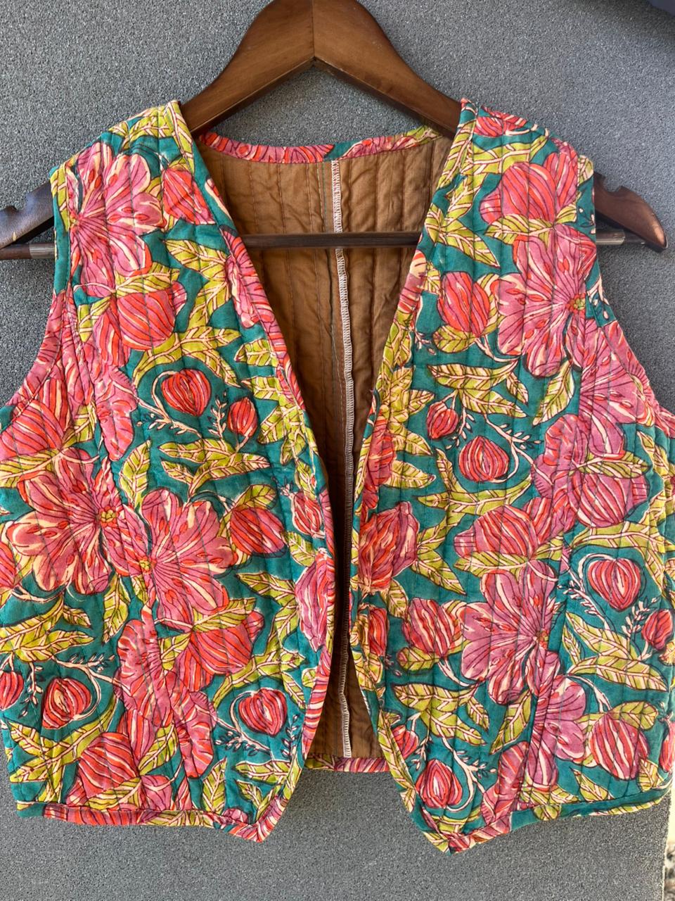 This floral quilted block print vest brings together comfort, color, and effortless style. Made from soft, breathable fabric with a lightly quilted texture, it features a vibrant floral print that instantly elevates any outfit. The sleeveless, open-front design makes it an easy layering piece—perfect over tops, tanks, or dresses. Lightweight yet cozy, this vest is ideal for everyday wear and transitional weather.