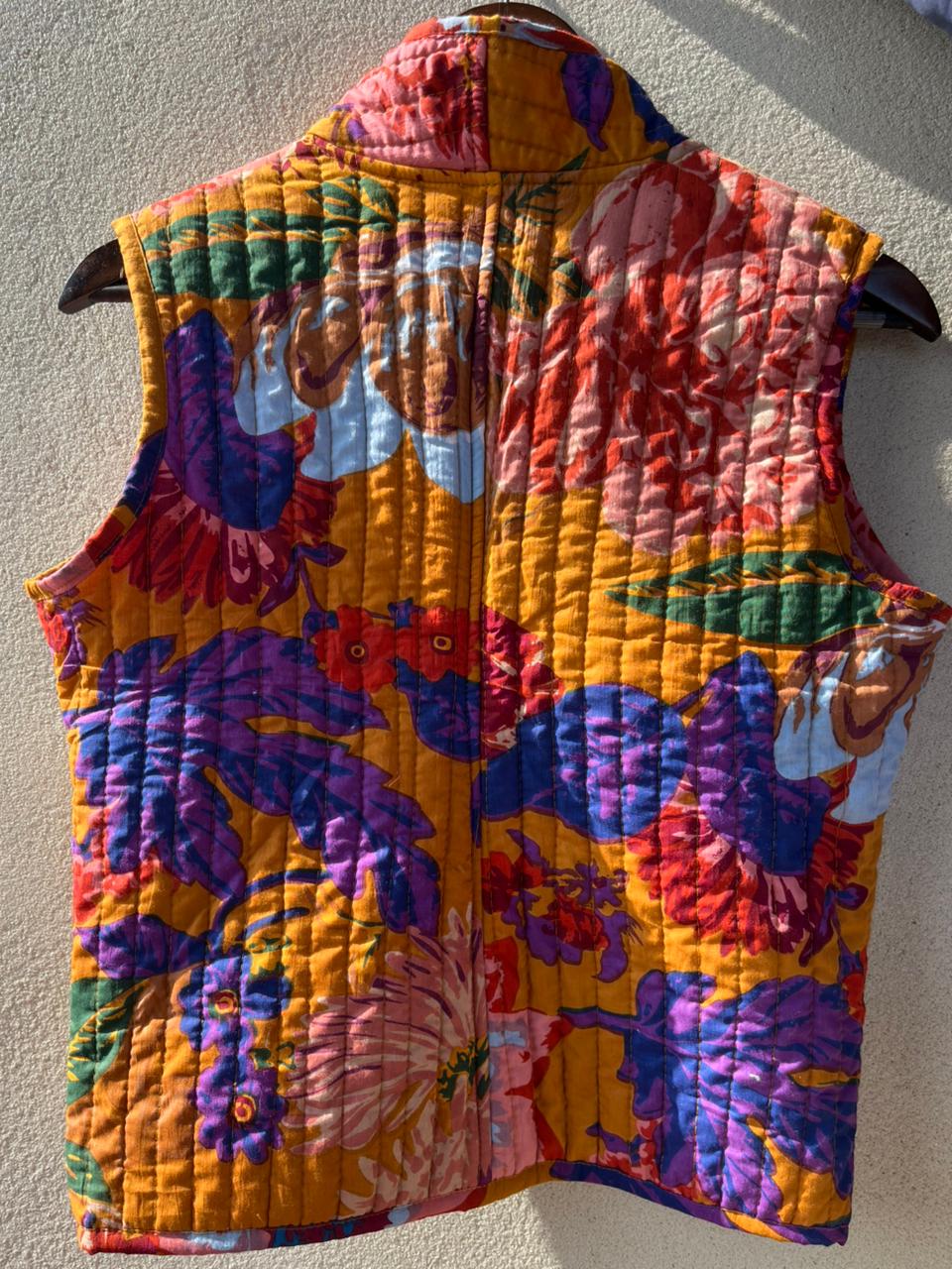 This statement quilted vest is crafted in vibrant botanical prints with a warm mustard base, bringing together comfort, color, and artisanal charm. Designed with soft padding and vertical quilting, it provides cozy warmth while remaining lightweight. The longer length and relaxed silhouette make it a versatile layering piece—ideal over tops, kurtas, or dresses. Finished with a contrast inner lining and functional pockets, this vest blends practicality with elevated everyday style.