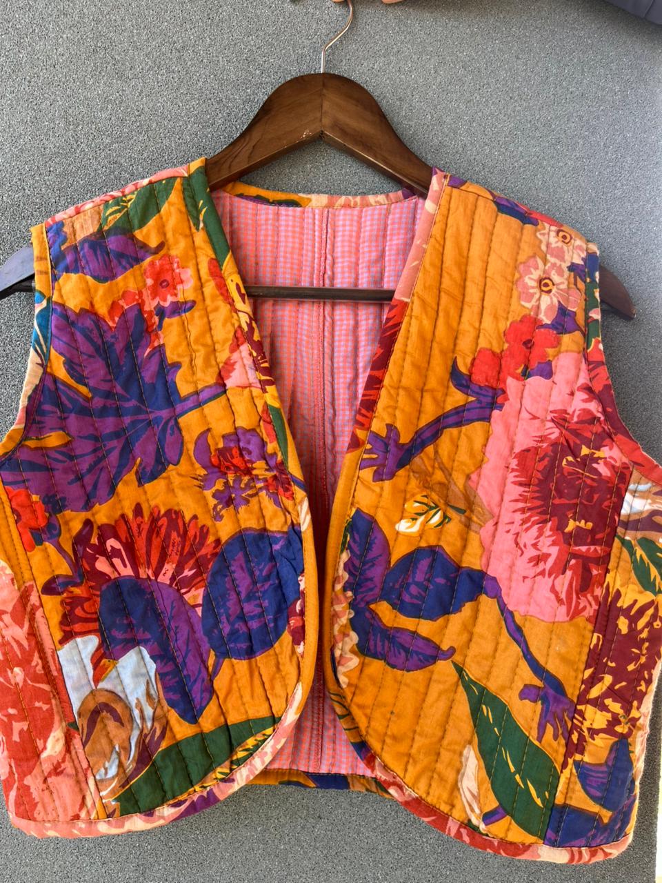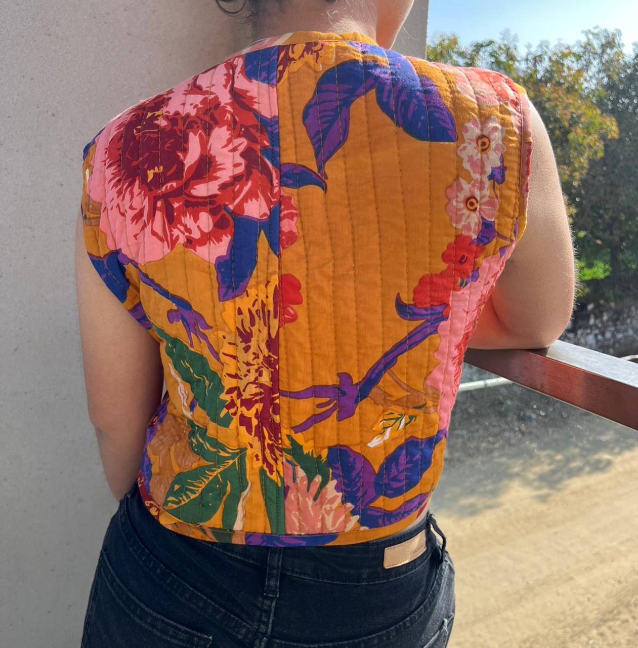 This handcrafted quilted vest features a rich blend of warm hues and artistic floral prints, making it a standout layering piece. Designed with soft padding and vertical quilting, it offers lightweight warmth and all-day comfort. The sleeveless, open-front silhouette allows effortless styling over tops, kurtas, or dresses. Finished with a contrast inner lining, this vest brings together traditional charm and modern versatility.