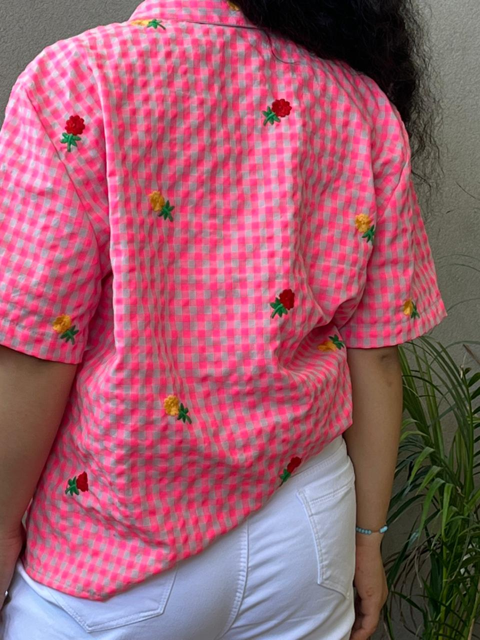 Playful yet polished, this Pink Gingham Floral Embroidered Shirt is designed to add a vibrant charm to your everyday wardrobe. Featuring a classic gingham check base in bright pink tones, the shirt is elevated with scattered floral embroidery that brings a handcrafted, feminine touch.