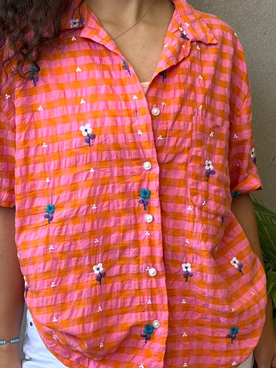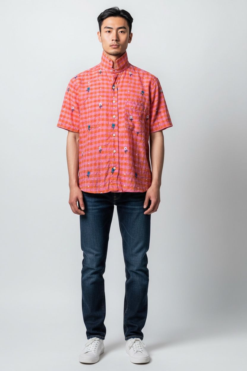 Bright, playful, and full of charm — this Coral Gingham Floral Embroidered Shirt is designed to bring a fresh pop of color to your wardrobe. Featuring a classic gingham check pattern in vibrant coral and pink tones, the shirt is enhanced with delicate scattered floral embroidery for a soft, handcrafted feel.